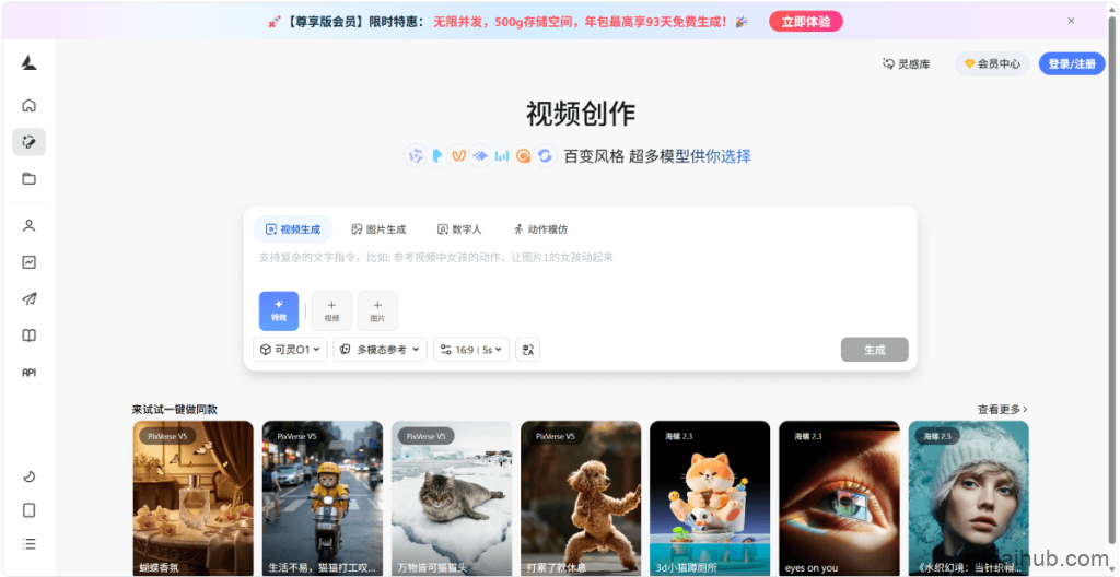 一站式图片视频创作平台,文生图、图生图、文生视频、图生视频,支持调用多个模型能力。同时,提供“数字人”和“动作模仿”功能。数字人功能中,用户可上传动漫角色或真人作为参考图,指定音色(或上传音色)和动作、说话内容,生成数字人视频。