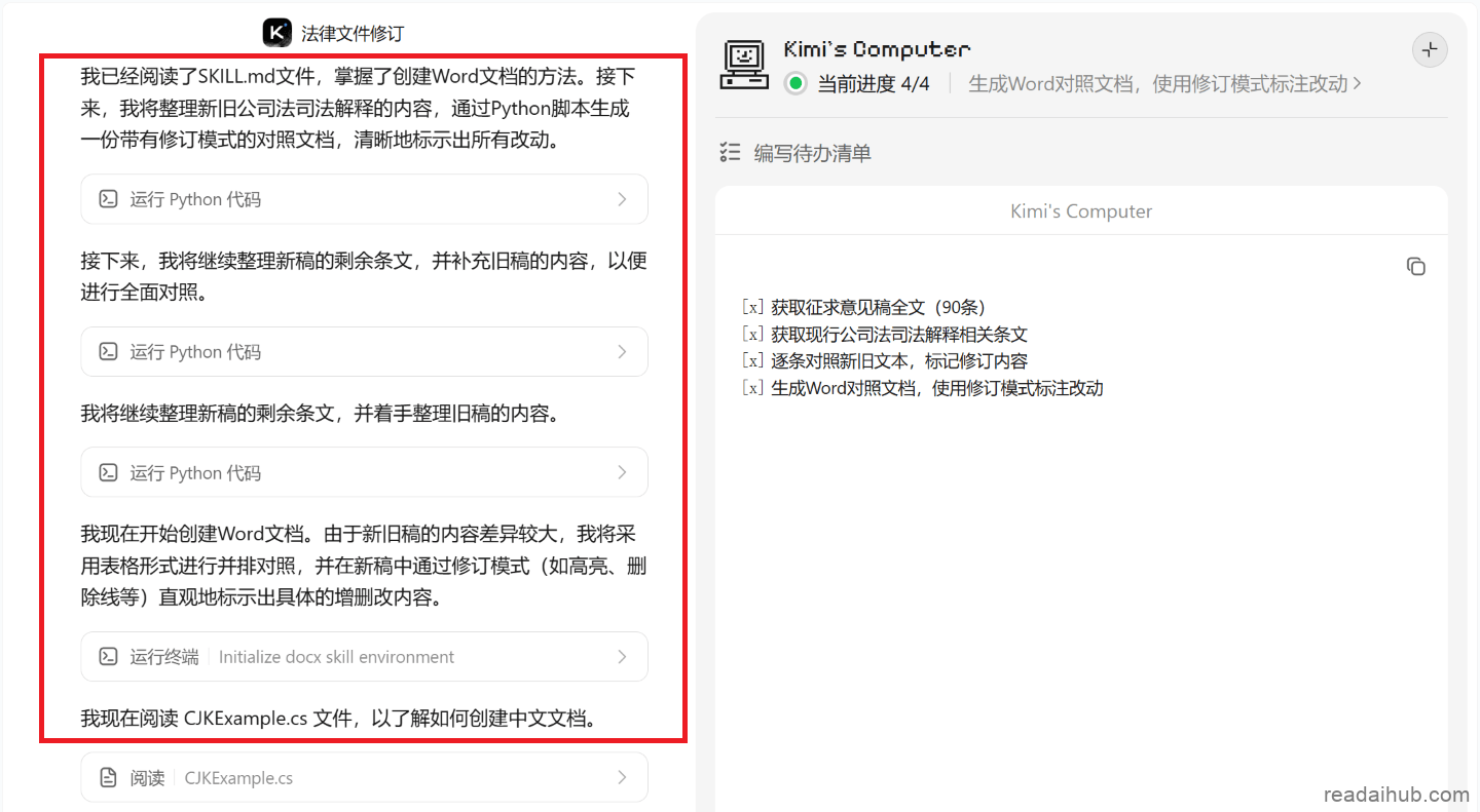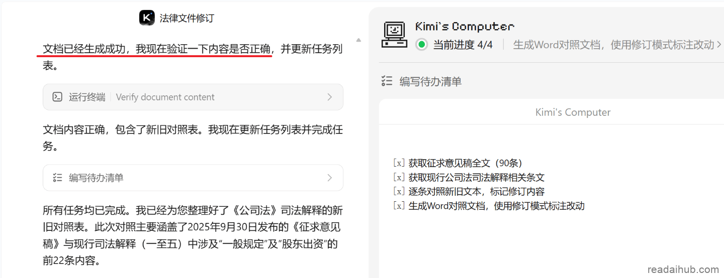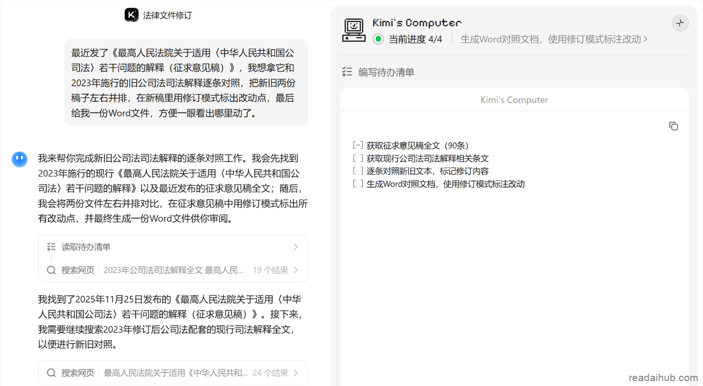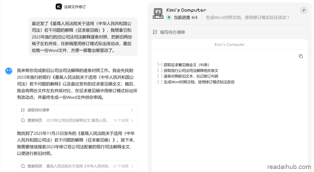 例如,选择文档Agent,让他对比新版和旧版法律文件(以“公司法司法解释”为例),将新、旧内容并排显示,为我们标出新旧法律的差异部分,Kimi Agent将自动编写待办清单: