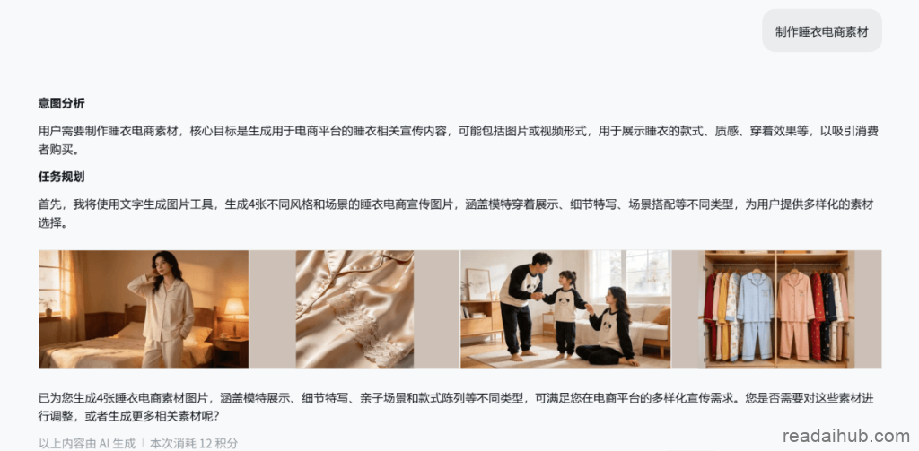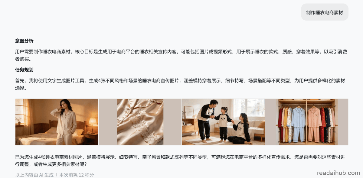 即梦是一个AI图片/视频/数字人创作平台,Agent模式的推出,大幅提升了AI创作的“语言友好性”,因为在使用图片、视频生成模型时,往往需要特别设计“提示词”,而Agent可以通过通俗的语言生成内容(如“制作睡衣电商素材”),降低提示词设计门槛。