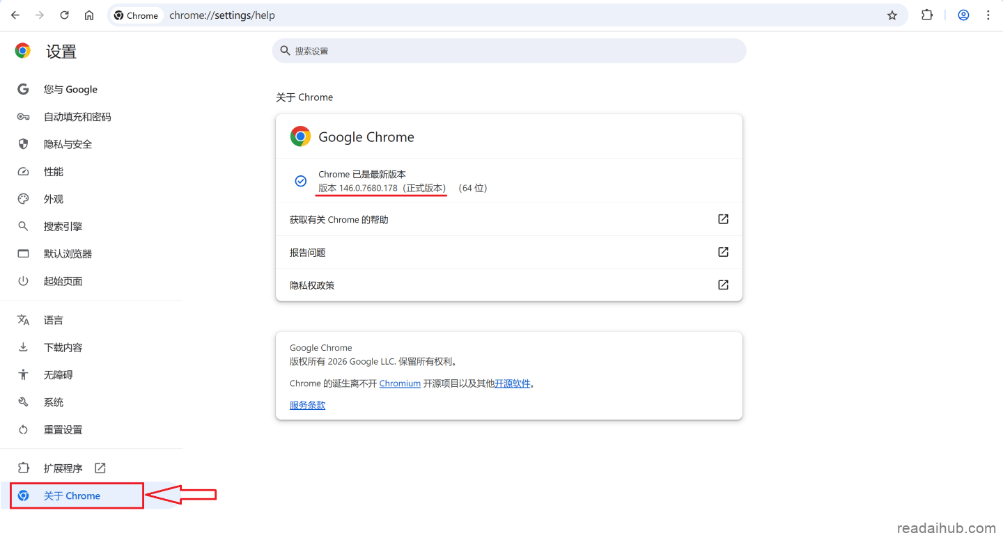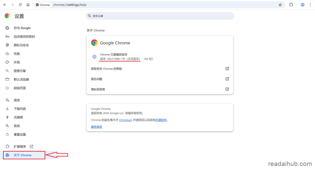 在“关于Chrome”页面即可点击更新或等待自动更新。